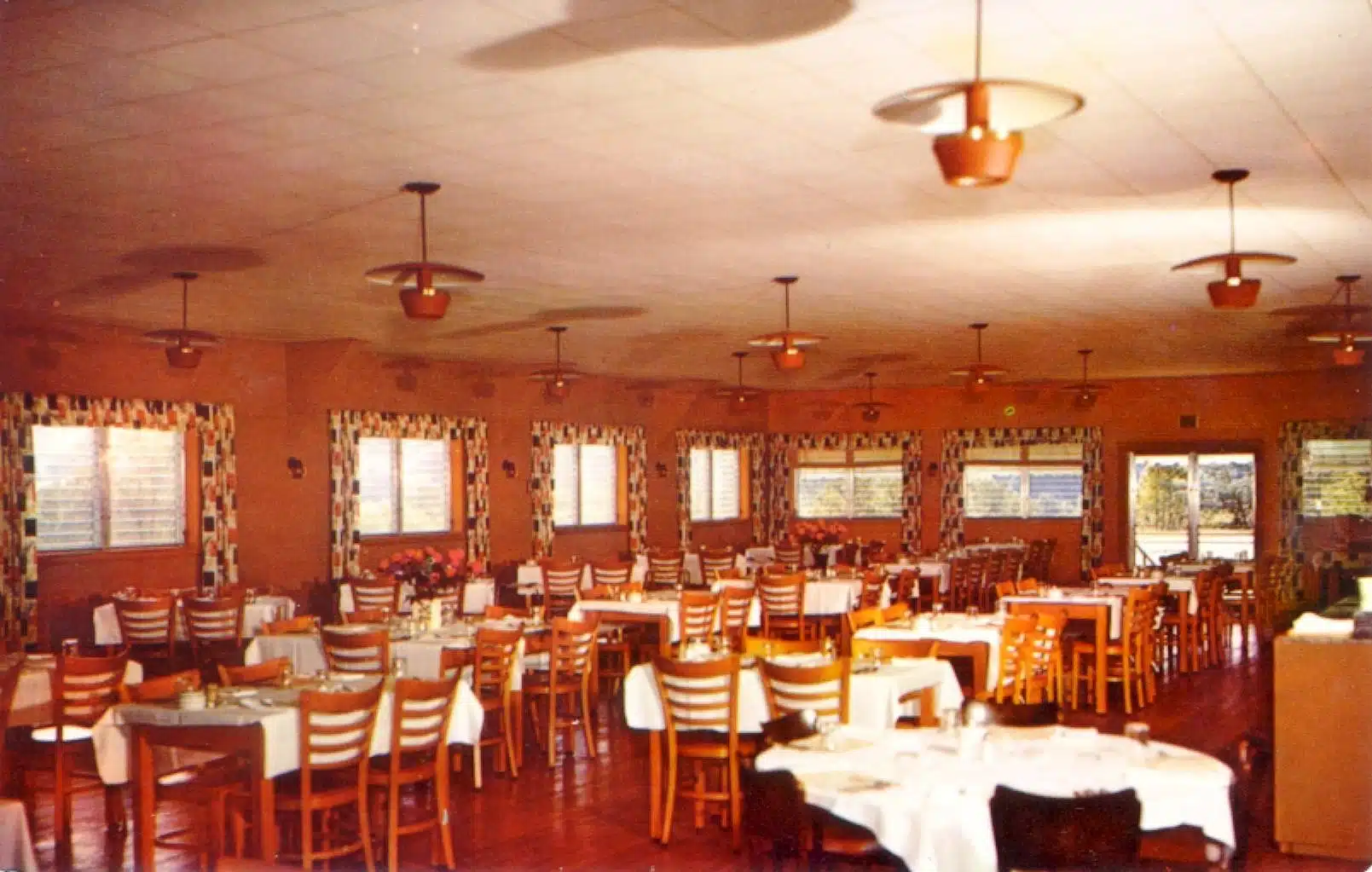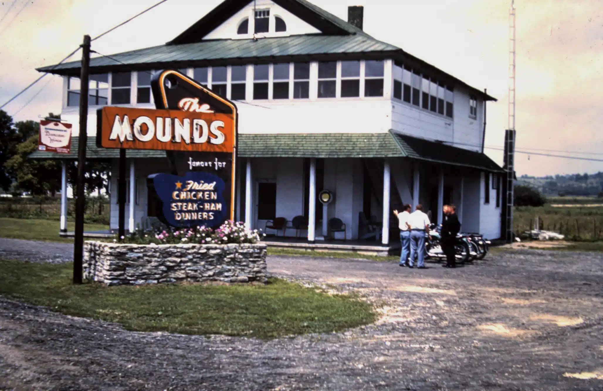 The owners who took over in 1941, Dick and Gail Watts, appear to be the ones who had the dance hall remodeled and converted into a modern dining room. The modification gave the restaurant a new seating capacity of 250 people. When the Watts owned it, they lived on the second floor of the original building and maintained the old dining room for overflow crowds and special events. It was known regionally, if not throughout the Midwest, for its fried chicken dinners, and became one of the biggest draws and weekend destinations for tourists for decades. When the Watts owned The Mounds, they boasted that they had numerous guest books that people signed – people from all over the world, who made Franklin County, and that restaurant, their destination.