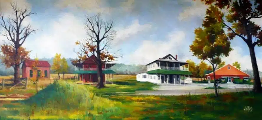 As I understand it, the LePoris painting of the Mounds came to the library via one of the former owners, Shirley and Scott May. Today, it proudly hangs in the Local History Department at the Brookville Library and catches the attention of everyone who walks through the door. It was painted in 1975 and was displayed in the restaurant for years. Many of you may remember LePoris. He was a Cincinnati native who discovered Franklin County and fell in love with it. In 1961, LePoris bought a farm near Metamora and moved his family there.  He soon became enamored with the beauty and charm of Metamora and bought a small building in the town.  In 1966, he opened the Fireside Gallery.  It was one of the first specialty shops in the new town of Old Metamora.